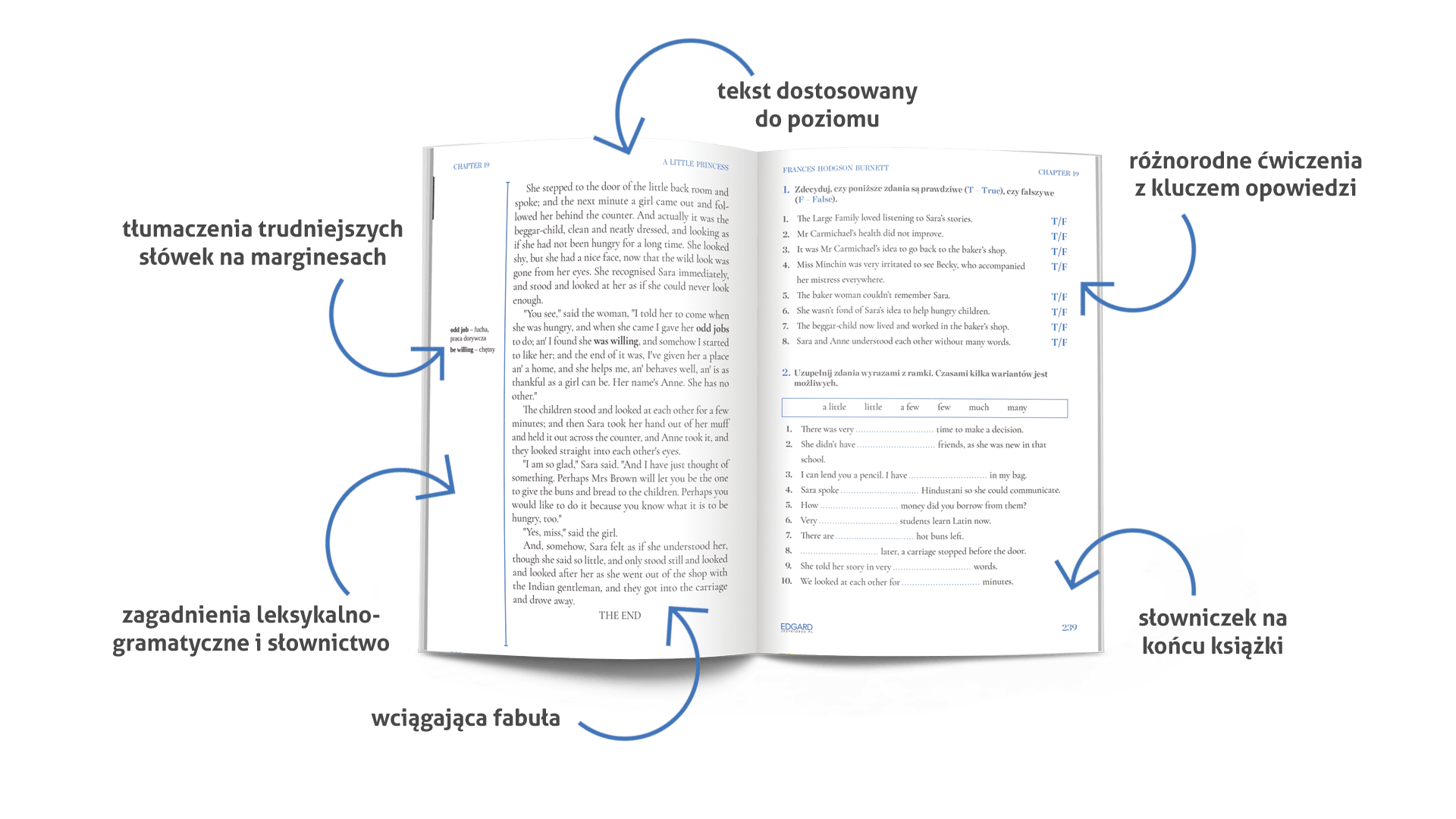 Angielski. A Little Princess to adaptacja powieści dla osób uczących się języka angielskiego na poziomie ponadpodstawowym i średnio zaawansowanym (A2-B1), która jest połączeniem lektury wciągającej historii z solidnym treningiem językowym. Ucz się języka podczas lektury intrygującego opowiadania dostosowanego do twoich umiejętności.