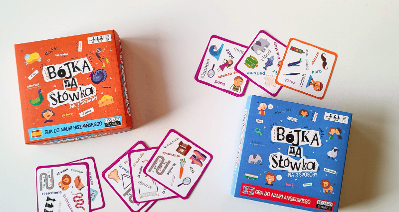 Bójka na słówka to świetna gra rodzinna dla wszystkich od 7. roku życia. To gra dla 2-8 graczy, którą łatwo wszędzie ze sobą zabrać. Krótka rozgrywka (10-20 minut) zapewni dynamiczne powtórzenie lub naukę słownictwa. Celem jest opanowanie około 200 słówek, podzielonych na dwa poziomy zaawansowania: podstawowy i zaawansowany w mowie i piśmie (czytanie globalne). Gracze kładą po jednej karcie na stół. Gra polega na jak najszybszym wyszukiwaniu pasujących do siebie obrazków i napisów i oczywiście na wypowiadaniu tych słówek. Osoba, która pierwsza odnalazła parę, zabiera obie karty. Wygrywa ten, kto zbierze najwięcej kart. Gra zawiera mini słowniczek obrazkowy, który ułatwi przyswojenie słownictwa dla początkujących. Bójka na słówka jest dostępna w trzech wariantach językowych: angielskim, niemieckim i hiszpańskim. W każdą Bójkę można grać na trzy sposoby, a każdy z nich jest równie skuteczny.