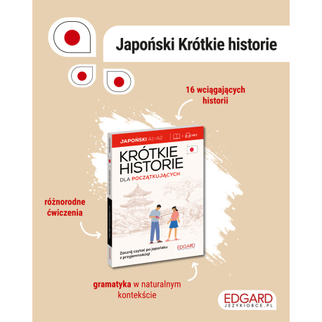Japoński. Krótkie historie. Dla początkujących to wyjątkowe podejście do nauki języka. Poznajesz ciekawostki na temat Japonii, czytasz wciągające opowiadania, słuchasz nagrań i równocześnie rozszerzasz japońskie słownictwo. Z tą unikalną książką masz okazję naprawdę otoczyć się językiem japońskim!